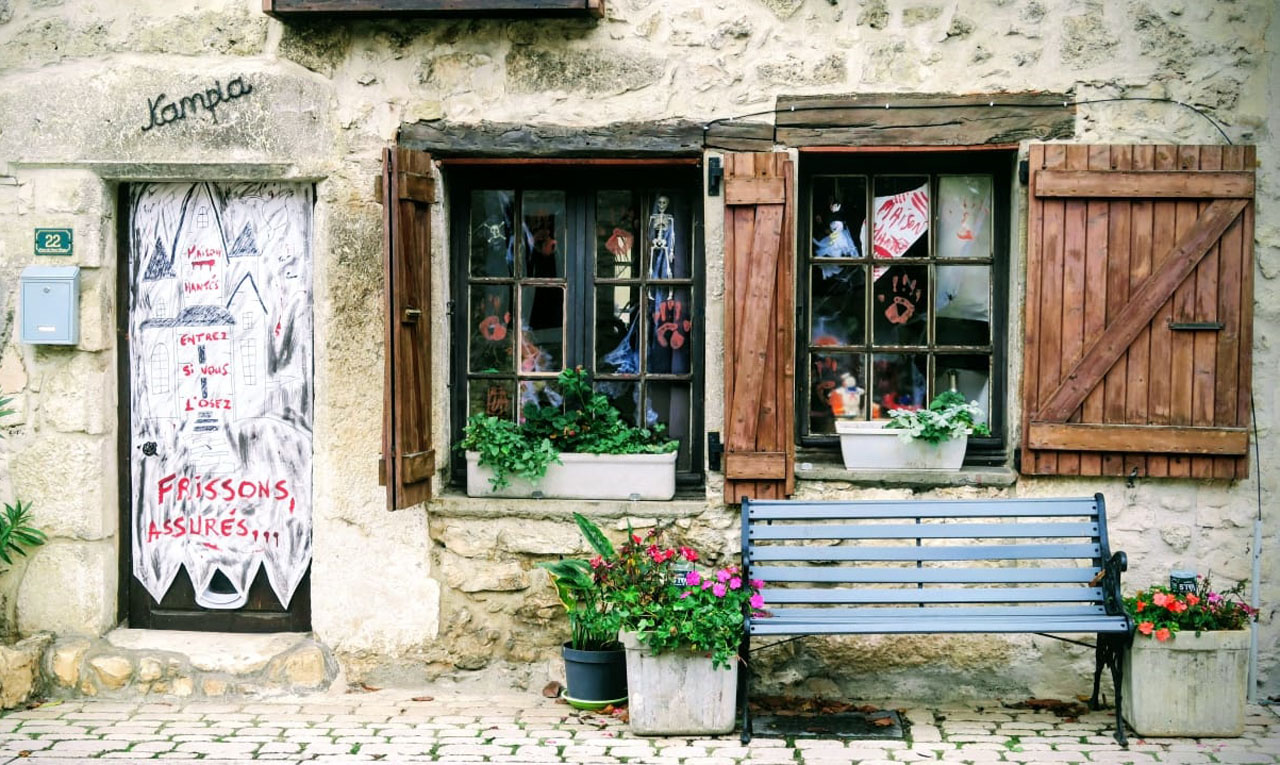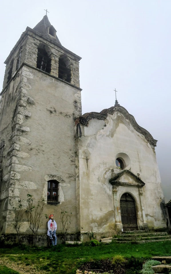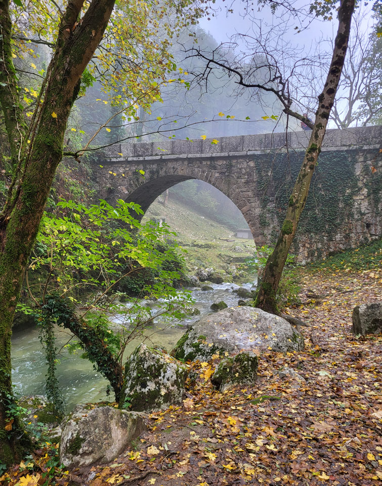 Pour démarrer, nous traversons le joli village de Cognin-les-Gorges où, sur les façades des maisons ou dissimulés derrière des fenêtres, en ce jour de Toussaint, des fantômes, vampires, sorcières et autres symboles de la fête des morts semblent vouloir nous décourager d’aller plus loin. Qu’importent tous ces totems ou symboles dédiés à l’au-delà, les narguant de nos photographies au passage, nous gagnons la vielle église puis suivons la direction des Gorges du Nan. Nous passons devant un ancien lavoir jusque rejoindre le Pont de Montchardon, 302 m.