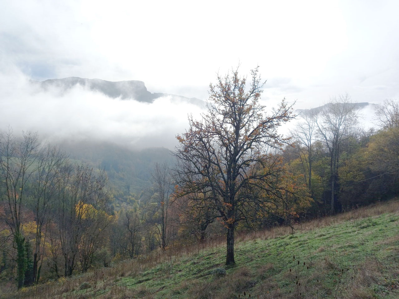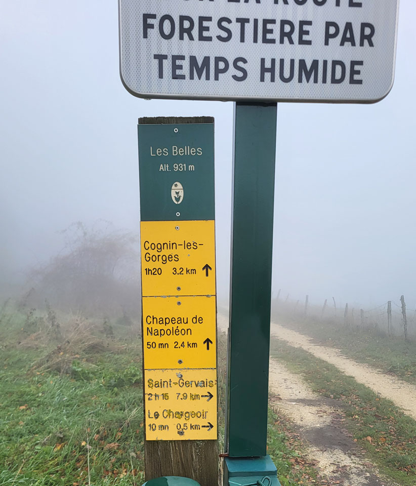 Sortant des Gorges, 642 m, nous prenons la direction de Le Moulin, 678 m, par la RD 22. La route est belle, mais appelle à la prudence, car des voitures y circulent. A le Moulin, direction La Malle, 786 m. Point duquel, après avoir cherché notre chemin au travers d’un pré abusivement clôturé qui nous oblige à quelques détours pour trouver le tracé de la carte, nous parvenons au chemin de La Malle d’où nous rejoignons Les Belles, 931 m. En ce lieu, malgré une brume persistante et une atmosphère rafraîchie, nous nous arrêtons pour la pause-déjeuner.