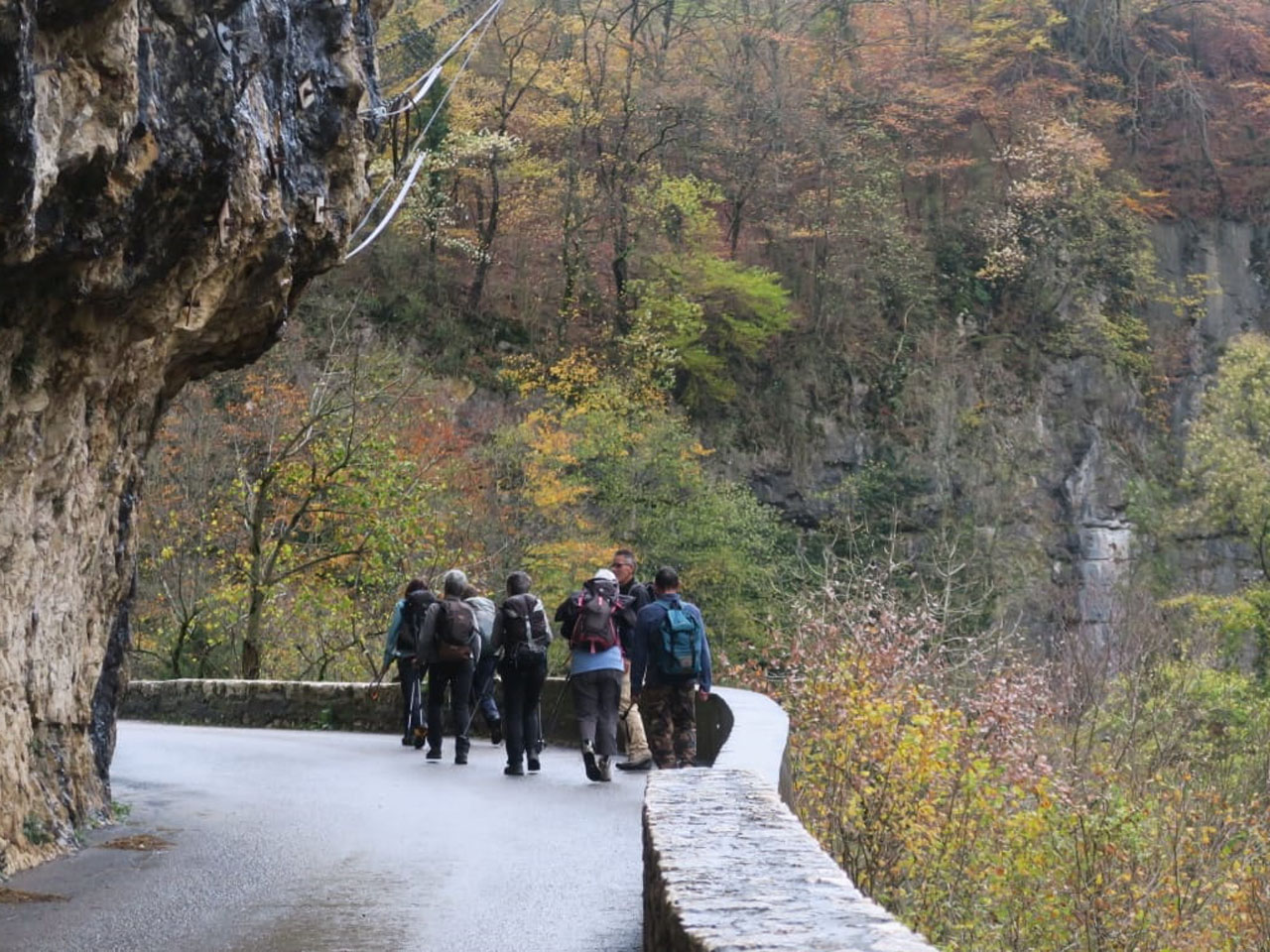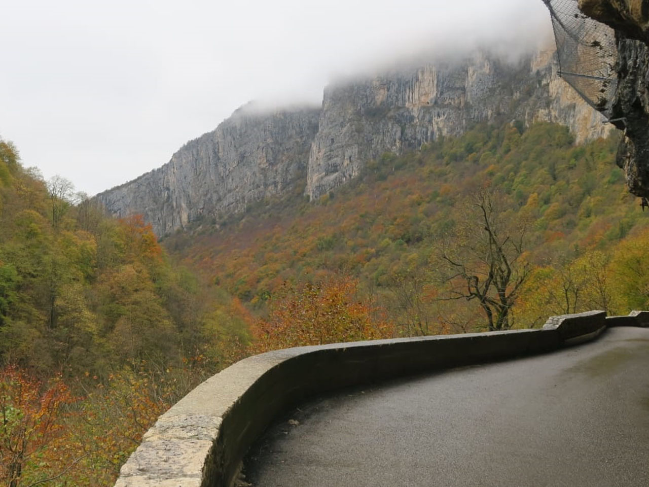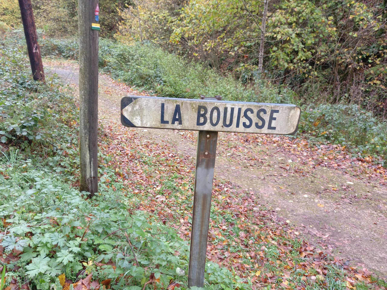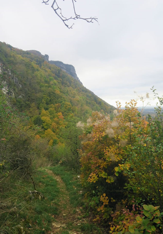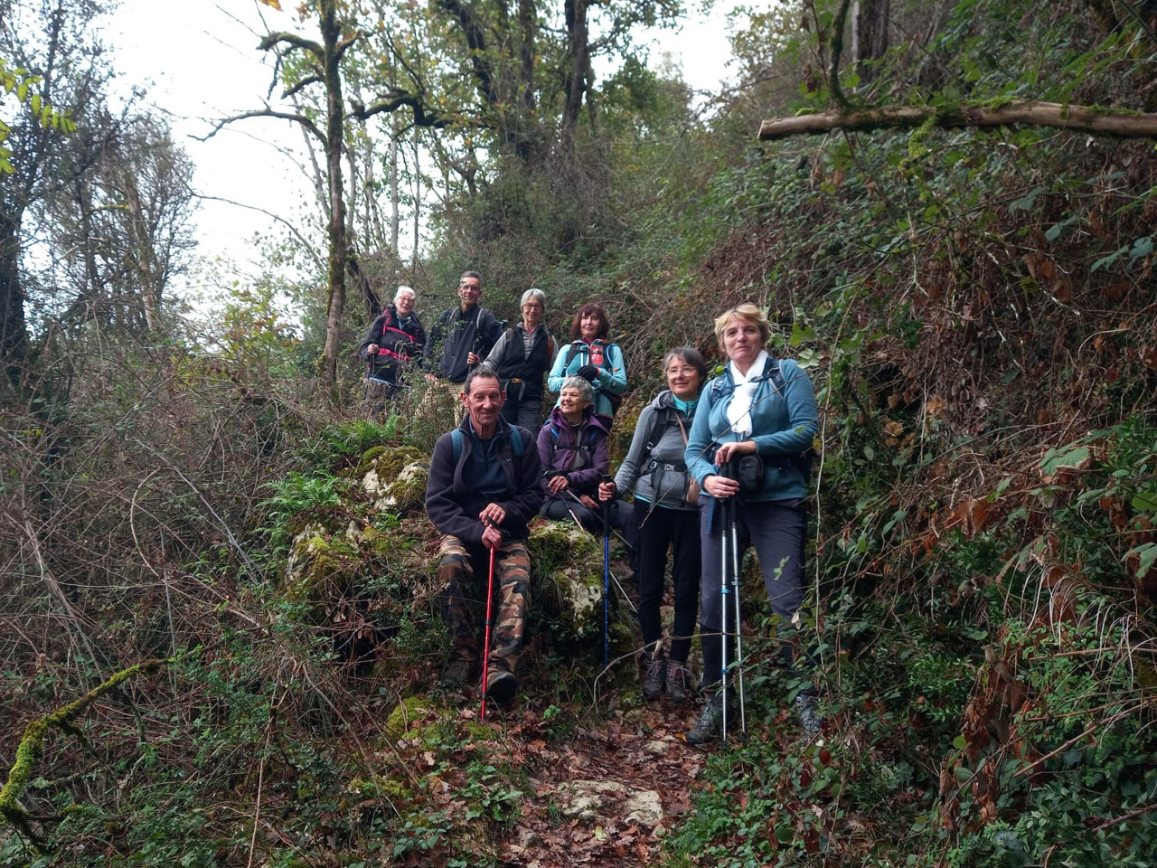 Il nous reste environ 1,5 km tout en descente pour mettre à terme à notre randonnée. Nous suivons un chemin qui coupe en différents points la RD 22 ce qui nous permet d’éviter un retour par le bitume. Le sentier présente par endroits des petits passages techniques sans grandes difficultés, mais rendus glissants par les pluies des jours précédents et l’amoncellement, de saison, de feuilles mortes. Il convient d’assurer le pas. Juste, à déplorer, une petite glissade sans conséquence de l’une d’entre nous. Il fallait bien une anecdote !