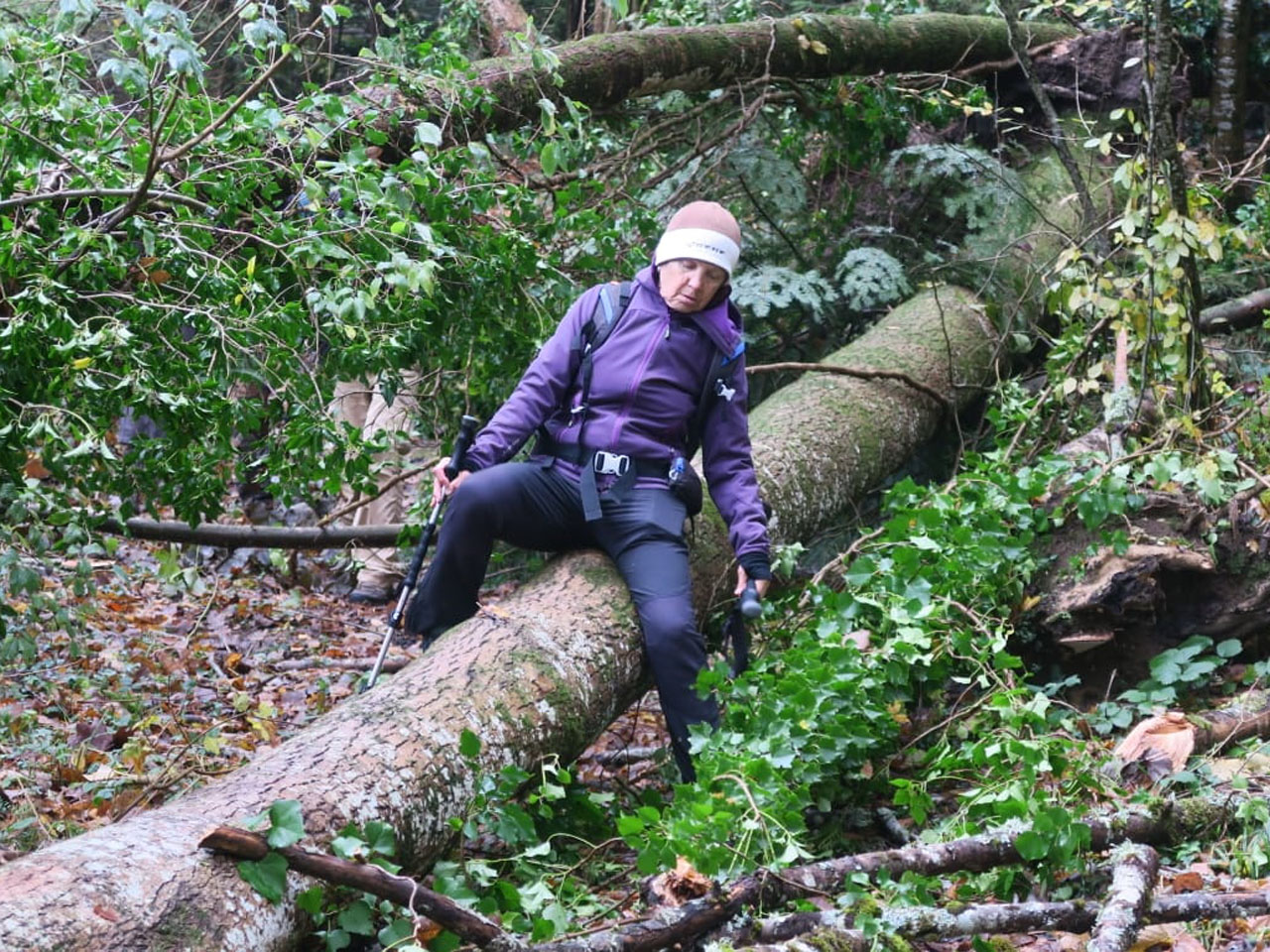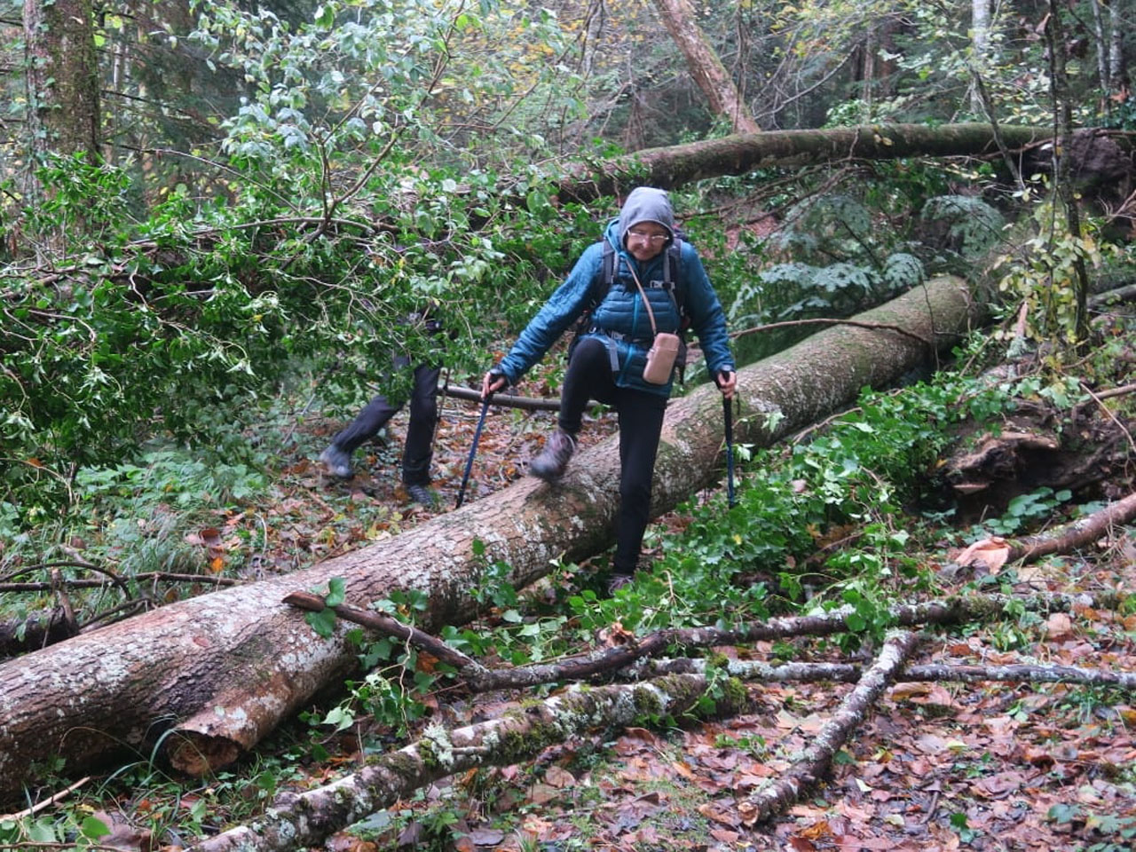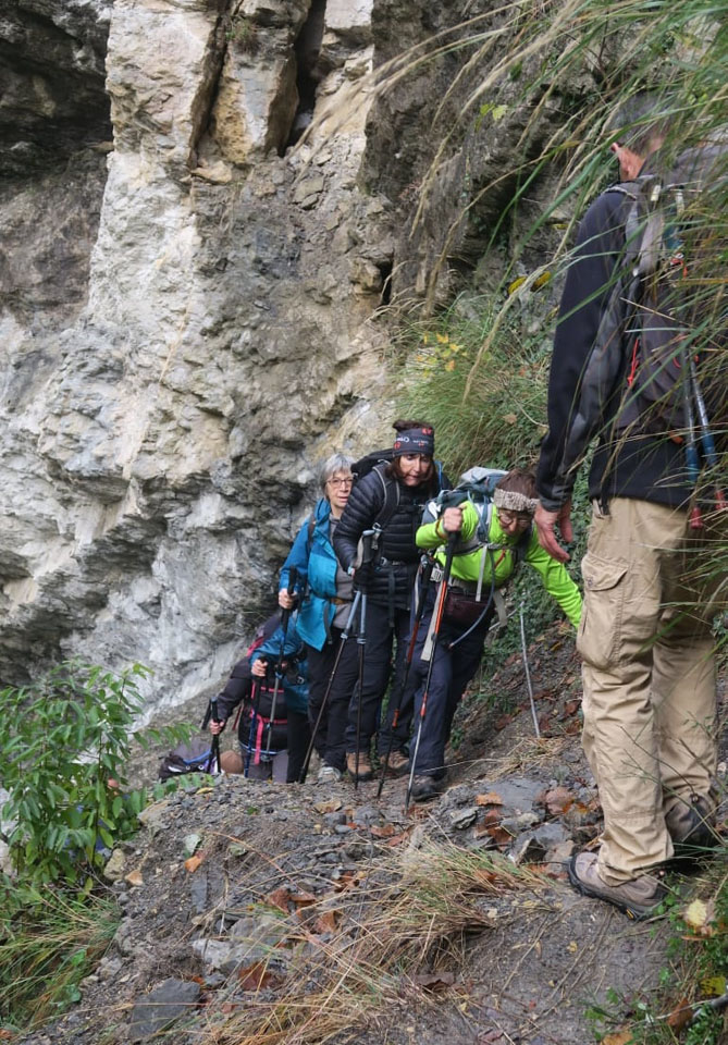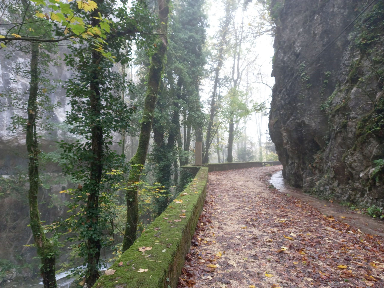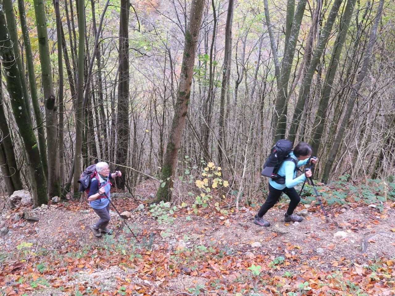 Il nous reste environ 1,5 km tout en descente pour mettre à terme à notre randonnée. Nous suivons un chemin qui coupe en différents points la RD 22 ce qui nous permet d’éviter un retour par le bitume. Le sentier présente par endroits des petits passages techniques sans grandes difficultés, mais rendus glissants par les pluies des jours précédents et l’amoncellement, de saison, de feuilles mortes. Il convient d’assurer le pas. Juste, à déplorer, une petite glissade sans conséquence de l’une d’entre nous. Il fallait bien une anecdote !