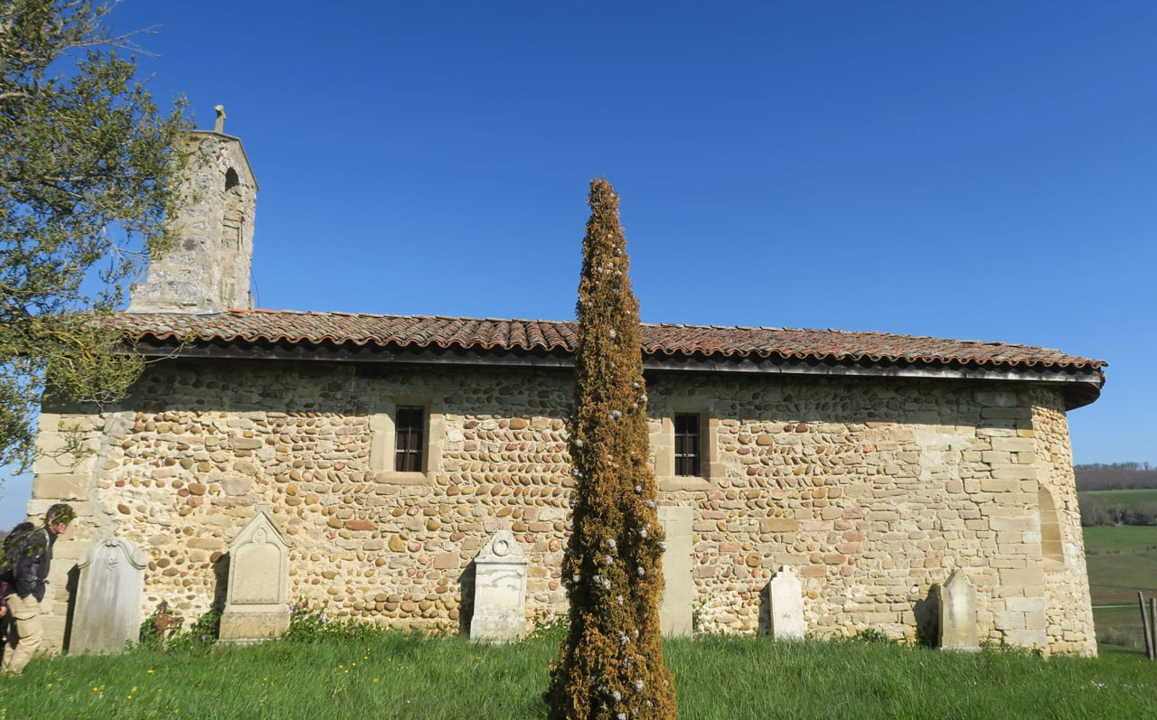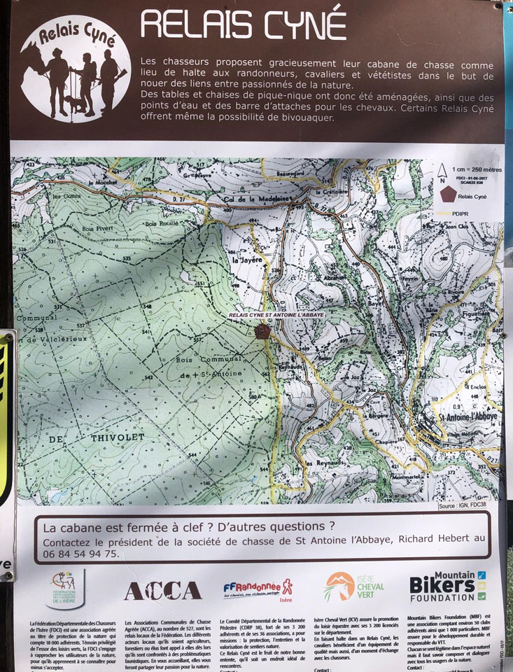 Depuis le parking à proximité de la salle des fêtes, le groupe s’engage dans la rue des Terreaux jusque rejoindre la route de Romans puis celle de Contamine. Empruntant, sur la droite, le chemin de Montmartel, le groupe, après une trentaine de mètres, le quitte pour prendre, sur la droite à nouveau, un chemin qui rejoint celui de Saint-Didier. La marche est agréable et la vue en surplomb sur l’abbaye est magnifique. A la croix de la Bergère, 434 m, direction Les Reynauds par le chemin des Pierres. Quittant ce dernier pour suivre le chemin de Joz puis, par une alternance de chemins et de route, le groupe rejoint les Reynauds, 537 m. Sur place, le Relais de Cyne Saint-Antoine l’Abbaye, cabane de chasseurs à disposition de tous, est le lieu approprié pour une petite pause.