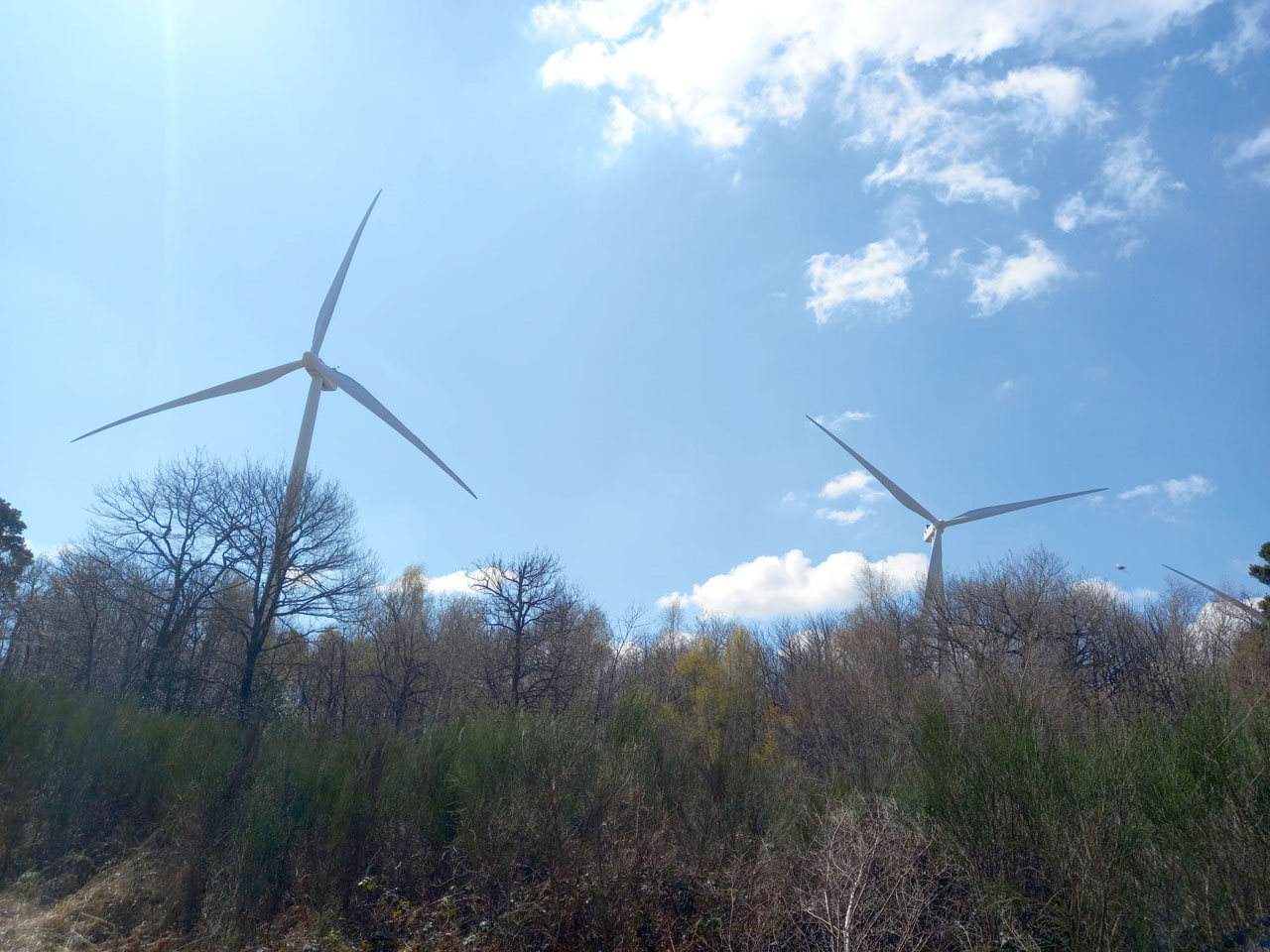 Il me plaît à imaginer, à proximité des éoliennes, un Don Quichotte des temps modernes, non pas chevauchant Rossinante, mais un vélo électrique, plus contemporain, accompagné de son fidèle compagnon d’aventure Sancho Panza équipé, quant à lui, d’une modeste trottinette électrique. Mais les pales des éoliennes sont situées bien plus hautes que celles d’un moulin à vent de l’époque du fantasque aventurier, alors, à moins de ne disposer d’un moyen de s’élever dans les airs, un Don Quichotte contemporain ne pourrait pas se faire happer par les bras ailés de ces hélices modernes. Je reviens à la réalité, car nous arrivons au lieu de la pause repas.