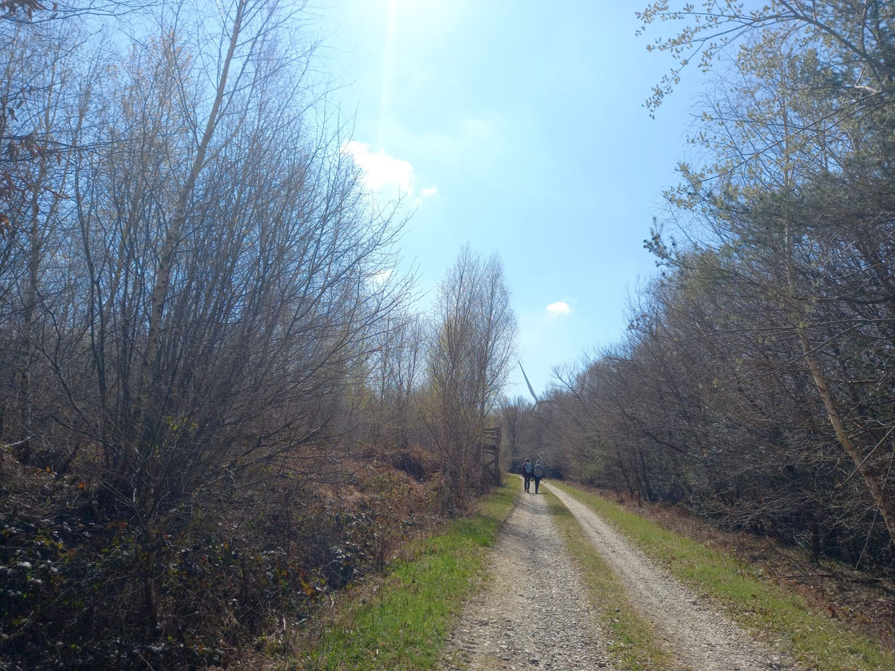 Du relais, direction la Jayère, 520 m, puis Dionay afin de rejoindre la forêt de Thivolet. Entre temps, nous passons devant une petite chapelle et ses tombes disposées tout autour. Elles ne sont pas récentes, en atteste les dates apposées sur leur pierre tombale datant pour certaines du 19ème siècle. Des histoires de familles y sont inscrites, occasion pour Hélène de quelques anecdotes. Au bout de la route de la chapelle, le groupe suit un chemin qui longe des champs afin de rejoindre et de traverser le bois Rouillé et, dans le mouvement, celui du bois Pivert. A l’intersection Forêt de Thivolet, 526 m, reprenant la direction des Reynauds, commençant ainsi la boucle du retour, le groupe gagne la piste qui dessert les éoliennes. A ce stade, nous décidons de remonter la piste jusque rejoindre un point d’intersection qui sera à la fois le point culminant de la journée, 546 m, et le lieu de la pause repas du midi.
